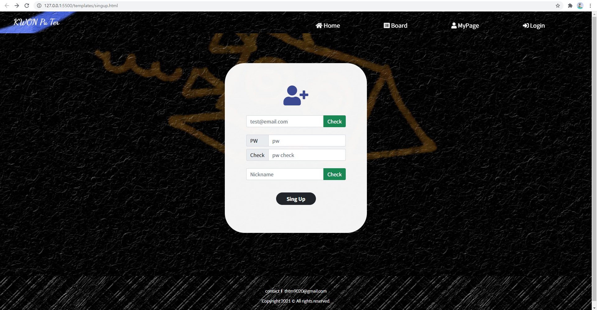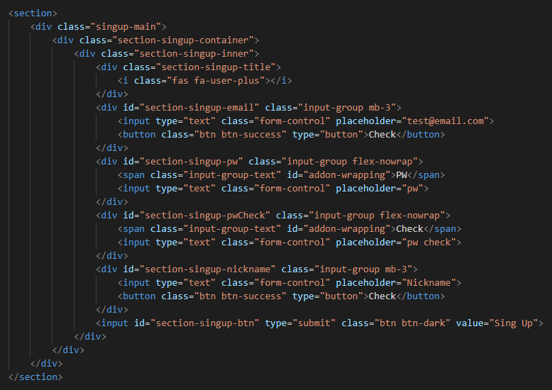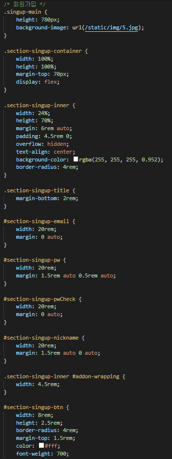 우선, 저번에 로그인 템플릿을 만들때, inner로 대충 감쌌더니 너무 백그라운드 이미지와 동화되어서 잘 안보이는 문제점이 있었다. 그래서 inner를 변형해서 하얀색 바탕을 만들고, 그 안에 타이틀, 이메일, 비밀번호 & 비밀번호 확인, 닉네임, 회원가입 버튼을 넣으면 될 것 같다. 그리고 생각해보니까, 로그인에서 로그인버튼 타입을 button으로 준것같은데, 나중에 submit으로 고쳐놔야겠다.
