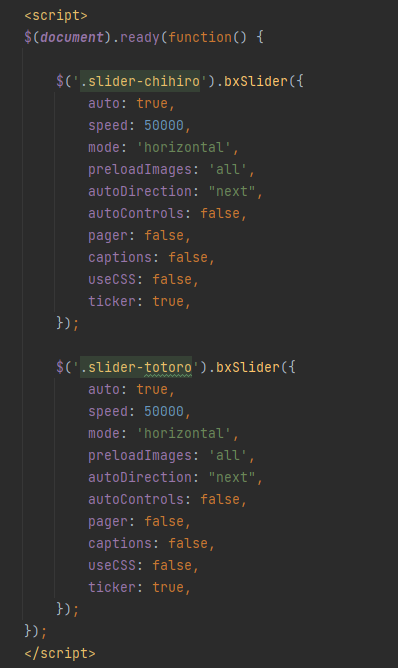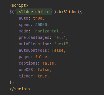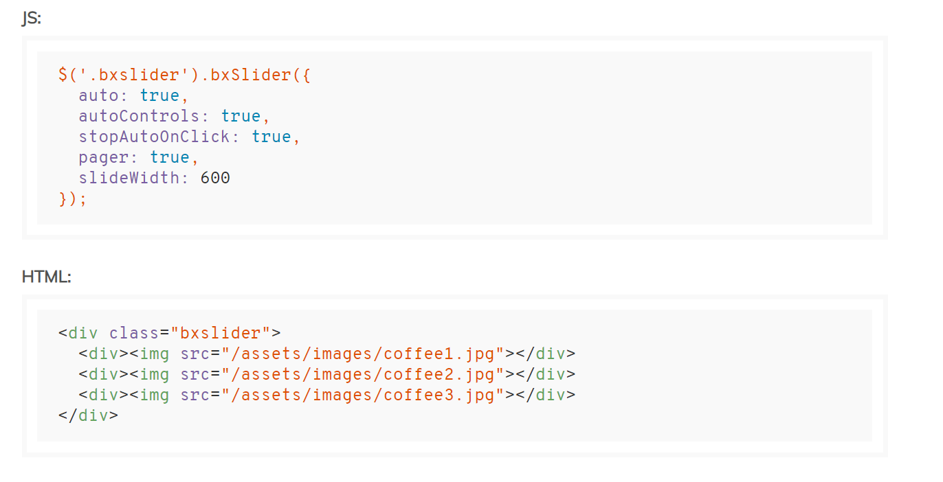 Initialize the bxSlider plugin This code tells the webpage to start the slider setup. Without this code the slider plugin would not be visible on the page.