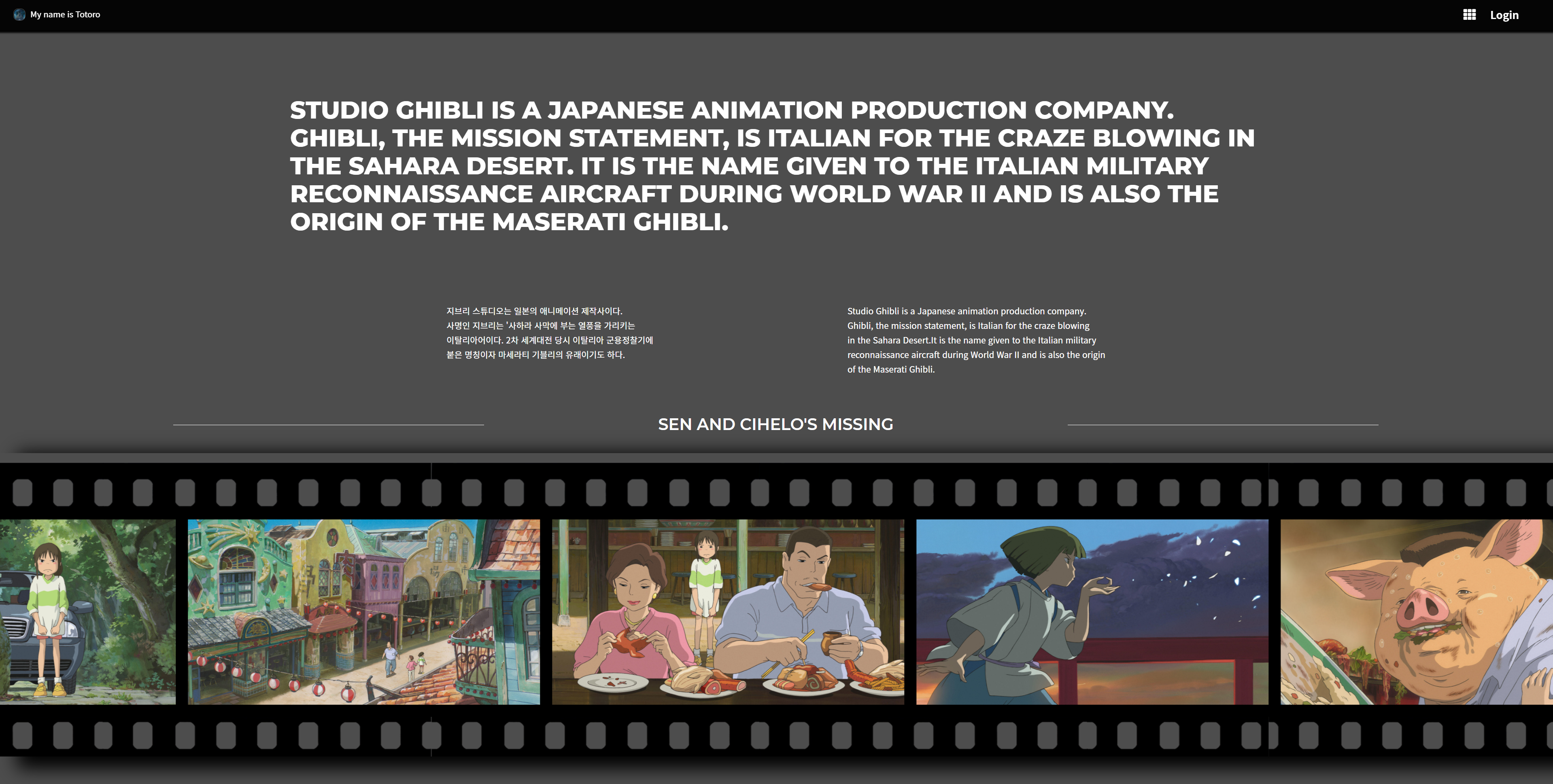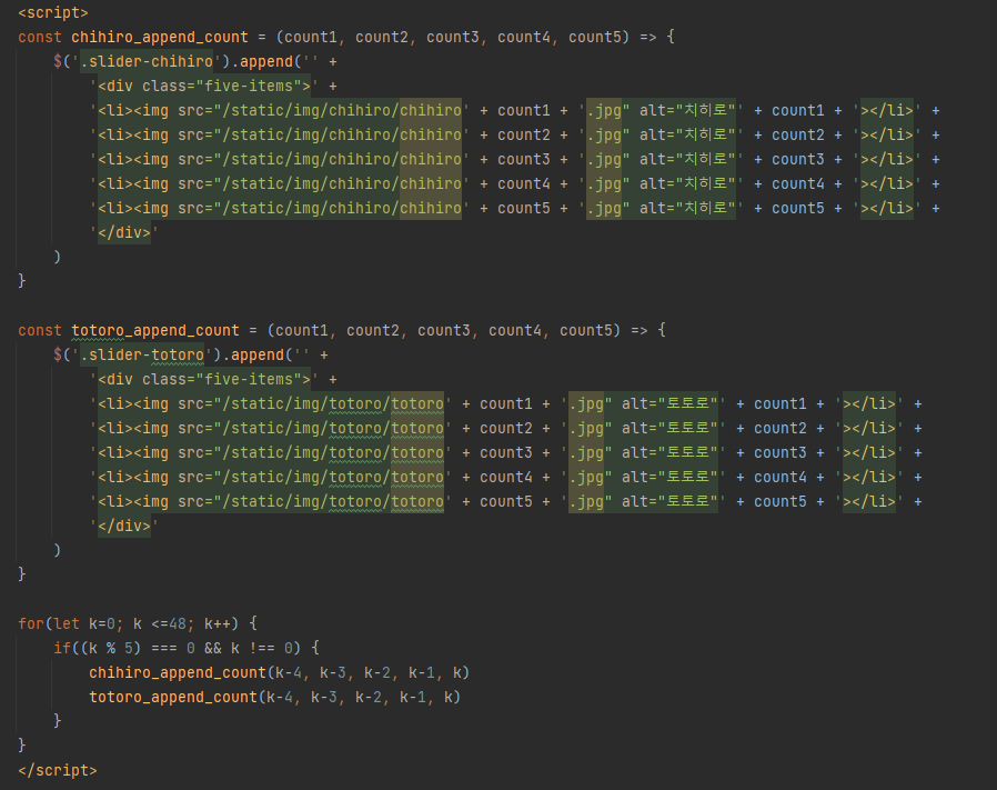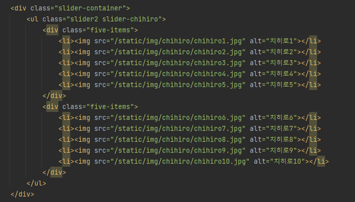 위에 ul태그로 구조좀 잡아놨는데, slider-chihiro에는 센과 치히로의 행방불명 이미지들을 넣을 생각이고, slider-totoro는 이웃집 토토로 이미지들을 넣을 생각이다.