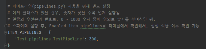 - 스파이더 실행 후, Enabled item pipelines를 터미널에서 확인해서, 설정 적용 여부 확인 가능