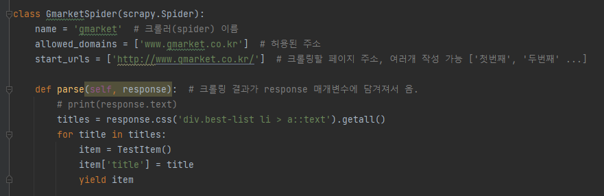 - 크롤링하고자 하는 데이터를 아이템(item)으로 선언해줘야 함