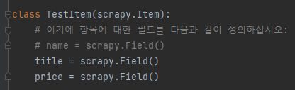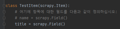 - 클래스를 만들고, scrapy.item을 상속받고, 아이템 이름을 만들고, scrapy.Field()를 넣어줘야 함.