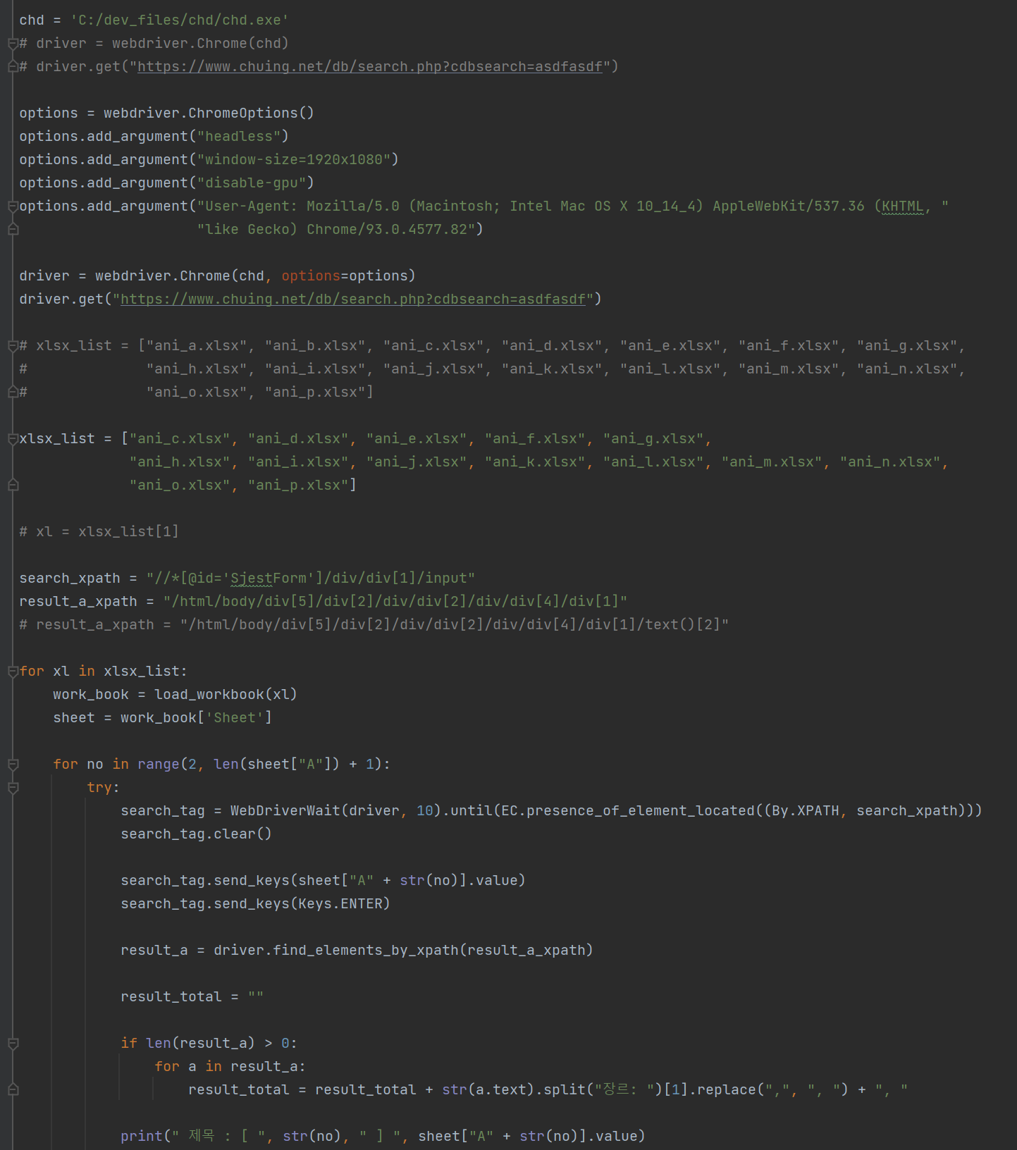 이제 빈 공백을 채울려고했는데, 검색하다보니 츄잉이라는 곳도 애니메이션 정보를 제공하길래, 여기서 장르를 뽑아오려고 크롤링중이다. 아무래도, IP차단 걱정도 있고 해서, 천천히 크롤링중인데, 시간이 좀 걸릴 것 같다. 오늘 하루는 크롤링 돌려놓고 내일 빈 공백들 찾고, 중복 제거해야할 것 같다.