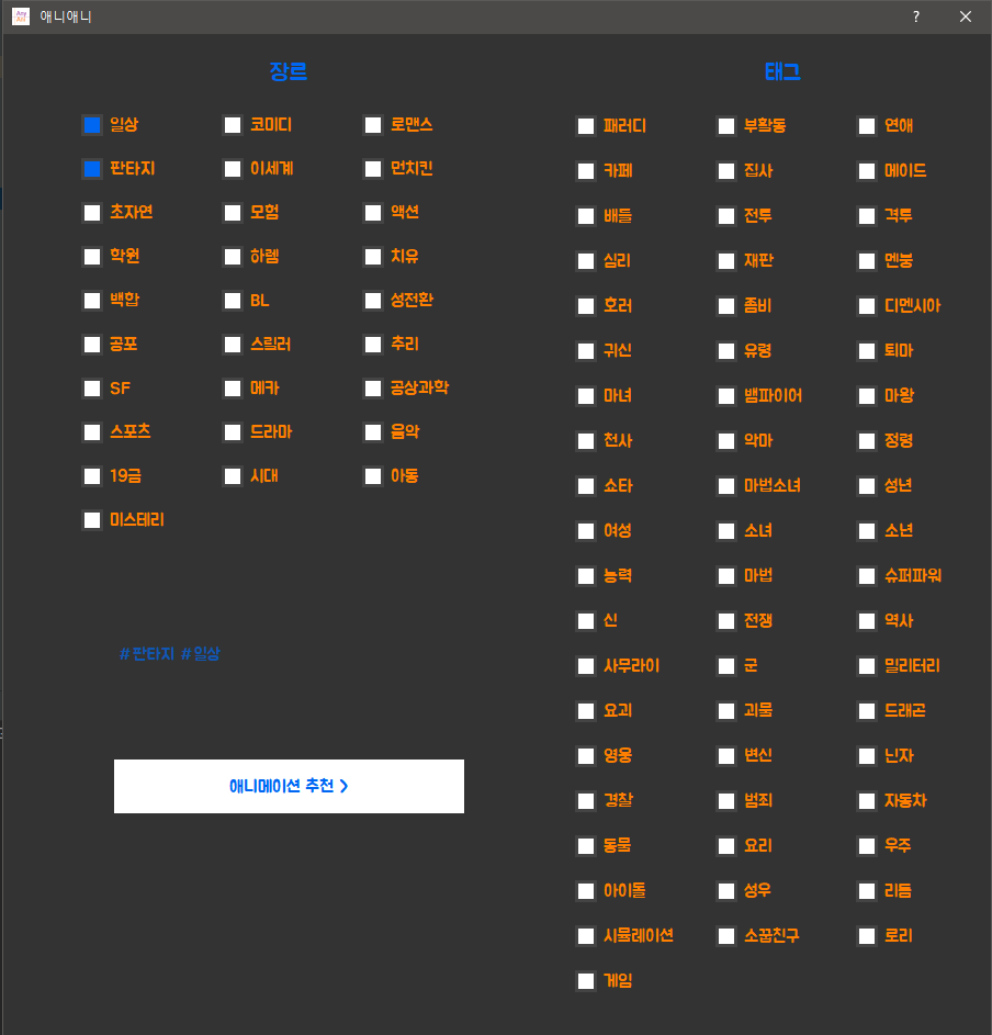 | 288일차 소프트웨어(Python) 애니애니(AnyAni) - 장르, 태그 선택 (0) | 2021.10.13 |