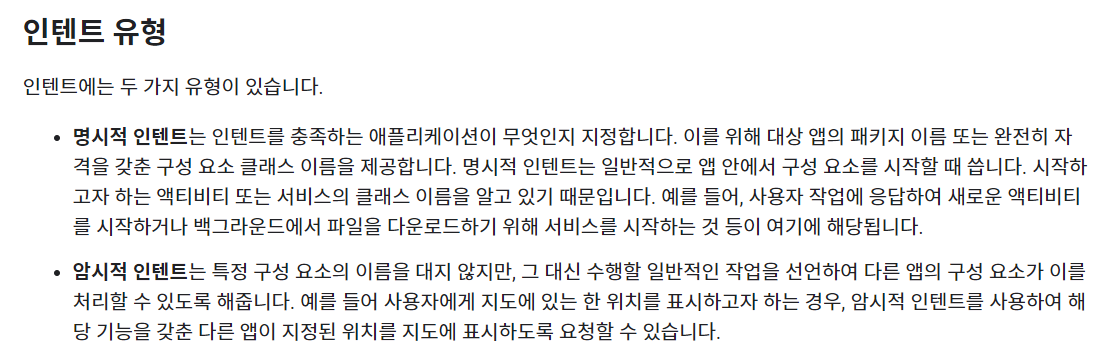 여기서 명시적 인텐트는 보통 일반적으로 사용하는 Intent 사용법으로 보인다. 암시적 인텐트는 파이어베이스 클라우드 메시징 서비스나 노티에서 해당 알림을 눌렀을 때, 원하는 화면으로 전환할 때, 사용하는 스킴을 말하는 것 같다.