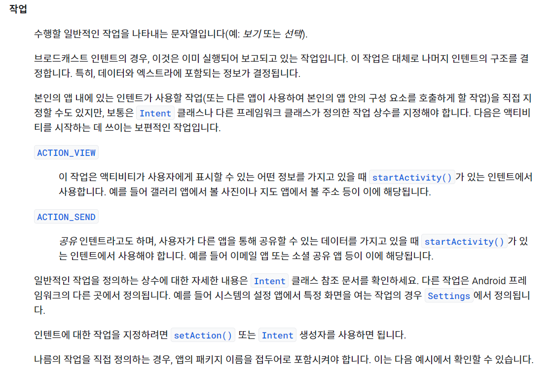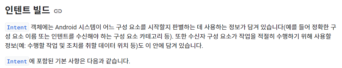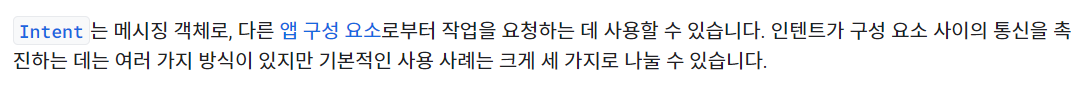 개발하면서 정말 많이 쓰고 있는 Intent인데, 단어 뜻으로만 보고 내가 원하는 기능을 담아내는 역할로 생각했다. 메시징 객체인지는 처음 알았다.