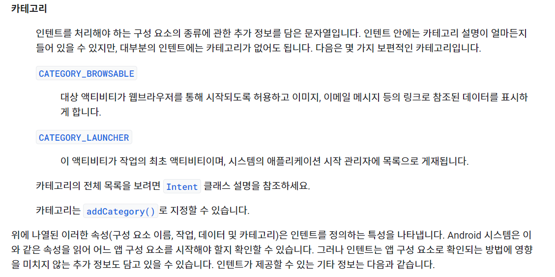 CATEGORY_LAUNCHER는 메인 액티비티 생성 후에, 매니페스트에서 자주 접했기 때문에 알고 있었다. CATEGORY_BROWSABLE은 잘 모르겠는데, 웹 뷰를 띄울 때, 저걸 사용했었던 것 같기도하고 다른 카테고리를 사용했었던 것 같기도하고 헷갈린다. 모든걸 암기할 수는 없으니까 대략적으로 그렇구나 하고 이해하고 넘어가면서 글을 정독해야겠다.
