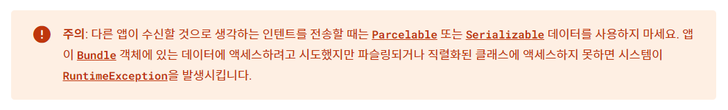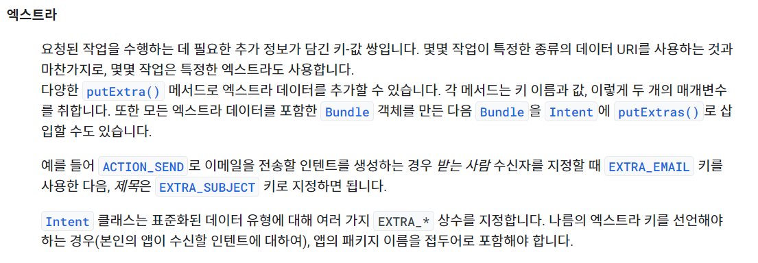 내가 생각했을 때, Intent의 가장 중요한 부분이라고 생각한다. 싱글톤으로 값을 관리하는 것도 좋은 방법이지만, 엑스트라를 사용해서 휘발성 데이터를 잘 사용하는 것도 중요하다고 생각한다.