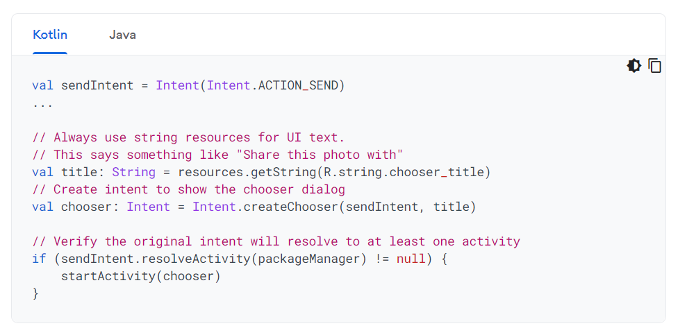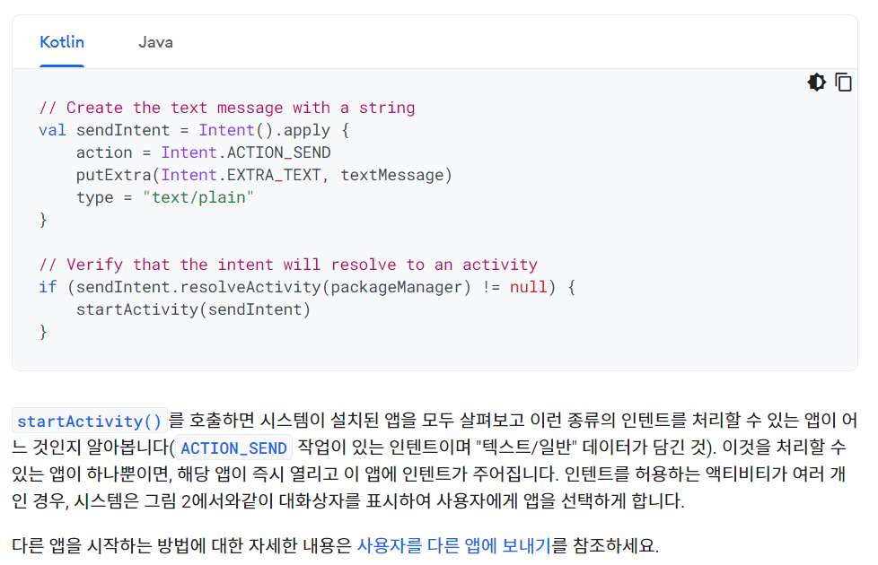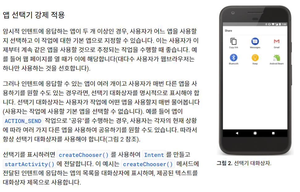 나는 지금까지 createChooser를 앱 선택상자를 좀 더 그럴듯하게 만들기 위해서 사용하는 줄 알았는데, 디벨로퍼를 읽어보니 잘못 사용하고 있었다는 것을 깨달았다. 여기서 중요한 부분은, 유저가 특정 기능의 기본앱으로 지정한 앱을 열게하는게 아니라 선택권을 주고 싶을 때, createChooser를 사용한다는 점이다.