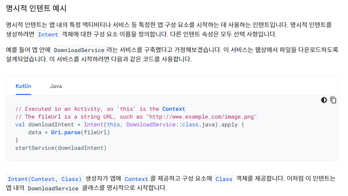 명시적 인텐트는 평소 우리가 사용하는 방법이다. 어떤 액티비티로 보낼 것인지와 패키지 네임을 통해 앱을 여는 코드들이 이에 해당한다.