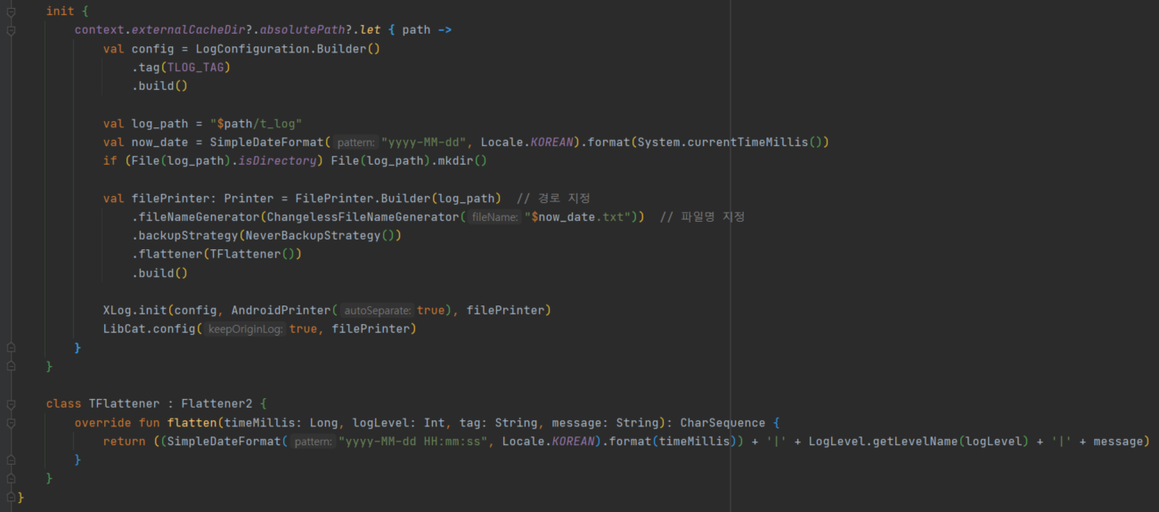 로그를 저장하기 위해서는 어디에 저장할 것인가의 고민거리가 생기는데, 나는 제일 만만한 앱 캐시경로를 저장 경로로 잡았다. 다만, 캐시경로를 가져오기 위해서는 context를 받아와야하는데 이게 정말 어쩔수가 없는부분이라서 사용할 때, 꽤나 불편하다. TLog(context).d("로그") 이러한 형식으로 사용해야하는데, 저 context 매개변수를 넣는 과정마저도 귀찮다.. 이를 해결하기 위한 방법도 있기는 하지만, 그정도로 할 필요성은 없기 때문에 여기서 마친다.