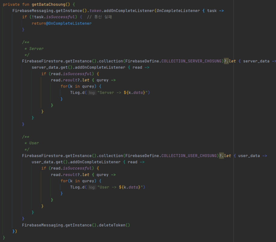 파이어베이스의 컬렉션 READ를 시도하고, 통신이 성공했을 시에 해당 결과값에서 내가 필요한 data를 빼내오는 코드이다. 해당 코드의 deleteToken은 말그대로 파이어베이스에 저장된 FCM 토큰을 삭제하는 메서드이다. 앱이 꺼지면 FCM과 연결이 끊기면서 이전 FCM 토큰으로 SEND를 보내면 NotRegistred 에러가 뜬다. 이를 방지하기 위해서는 토큰을 초기화하고 다시 토큰을 받아오는 방식을 취해야한다. 위의 코드는 테스트하기 위한 코드이고, 앞에서 말한 부분의 보완은 따로 작업해야한다.