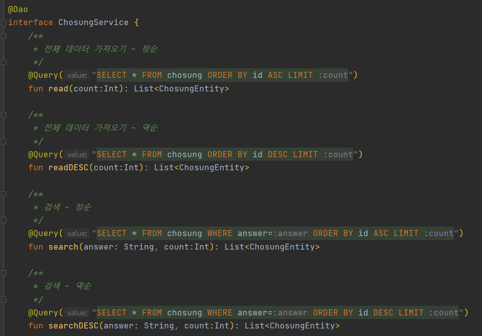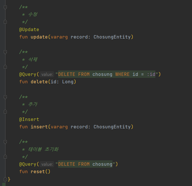 나는 룸을 사용하면서 기본적인 쿼리문은 위의 방식대로 모두 작성해 놓는 편이다. 가장 필수적인 요소인 CRUD와 초기화 그리고 검색 기능이다. 이외에는 특정 기능을 수행하기 위한 쿼리문일뿐, 대부분은 위의 쿼리문으로 충분히 커버가 된다. 다만, 최적화를 위해서 조건문을 추가로 작성할 뿐이다.