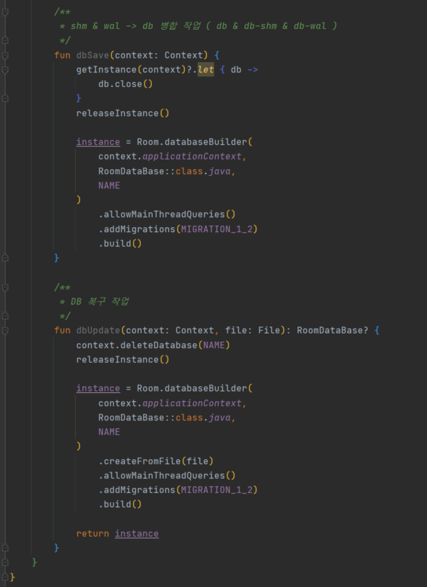 dbSave와 dbUpdate 메서드를 보면, 왜 저렇게 나뉘었는지에 대해서 의문점이 들 수 있다. 나도 직접 해보고나서 알았는데, 데이터를 백업할 때, 파일을 내보내야하는데 이 때, db파일은 db, db-shm, db-wal 이 3가지로 분할되어있다. 이 3가지 파일을 db 파일 1개로 병합해서 내보내기 위해서는 룸을 한번 내렸다가 다시 올려야한다.