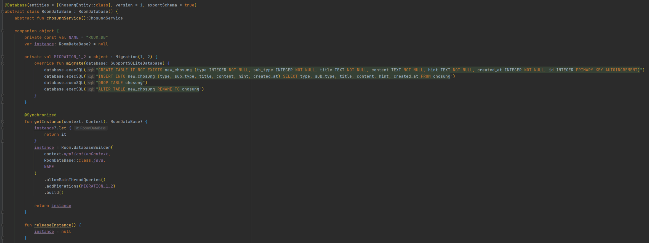 우선 MIGRATION_1_2 변수를 보면, database.execSQL() 메서드를 사용하는 것을 볼 수 있다. 마이그레이션 하면서 데이터를 어떻게 적용시킬것인가? 에 대한 쿼리문 작성이다. 나는 기존에 있는 데이터는 전부 날리고 새롭게 복구하는 데이터를 넣는 방식을 채택했다. 장고처럼 자연스럽게 기존에 있는 데이터와 병합하기에는 단순한 쿼리문으로는 어렵기 때문에 시간대비 코스트를 생각해서 쿼리문을 작성했다.