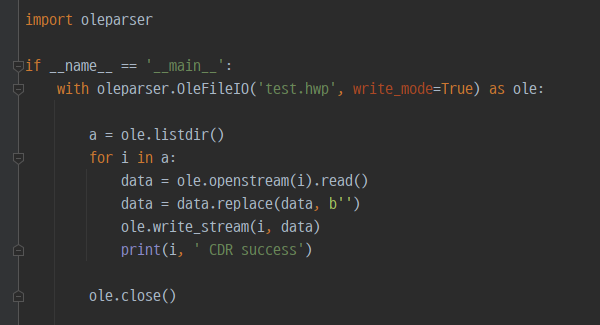 한글문서 내부 스토리지 BinData에 들어있는 모든 스트림의 값을 0으로 치환해버리는! 소스코드를 만들었다. 누군가는 정말 쉽게 만들겠지만 나처럼 파이썬 초보자가 만들기에는 정말 고난의 연속이었다. 매일매일 고민하고 생각했는데 이렇게 만드니까 정말 뿌듯하기 그지없다.