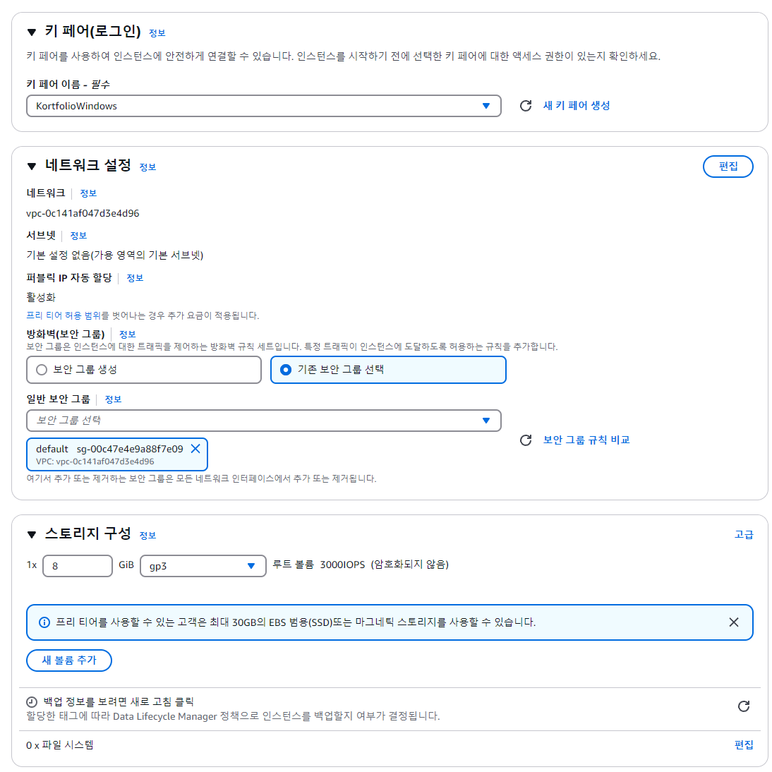 네트워크 설정에서 '기존 보안 그룹 선택'으로 모든 트래픽을 허용하는 default vpc를 선택해주시고, 스토리지는 프리 티어인 경우 30GB까지 무료라고 하지만, 제 기억상 GB단위로 요금이 산정됬던것으로 기억이 납니다. 혹시 모르니까 기존값인 8GB로만 설정해줍시다. 이정도만해도 충분해요.