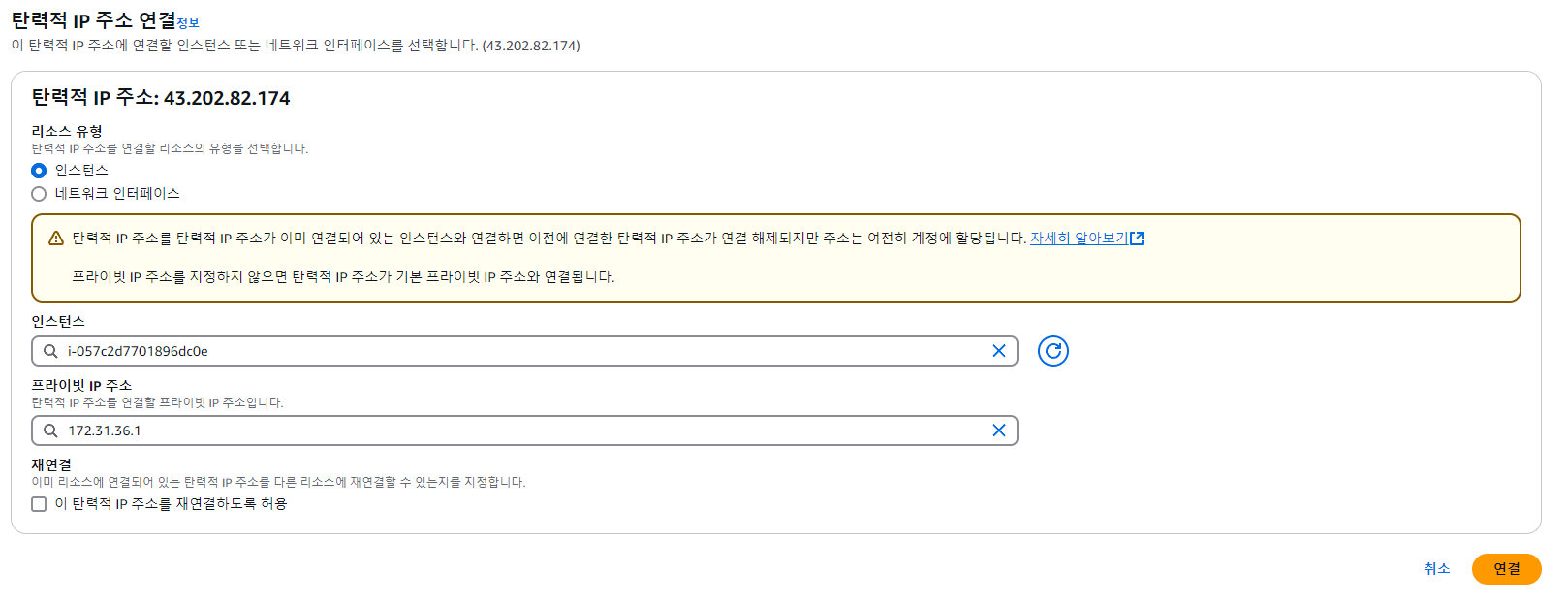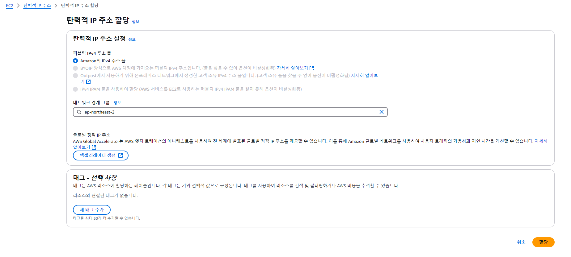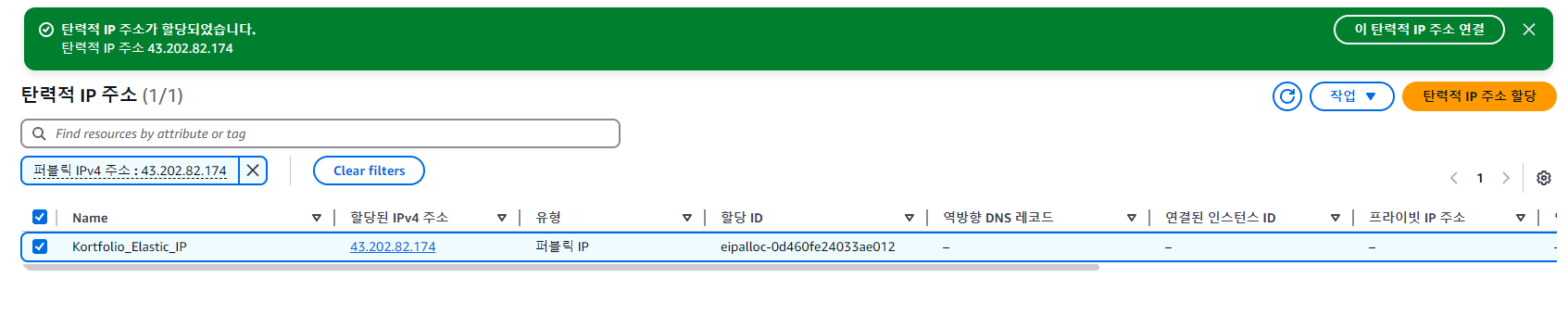 호스팅을 위해 탄력적 IP도 설정해줍시다. EC2는 재시작시 계속해서 IP가 변경이 되는데, 탄력적 IP를 설정해주면 IP가 고정이 되서, 도메인 연결과 SSL 인증을 위해서는 필수입니다~!