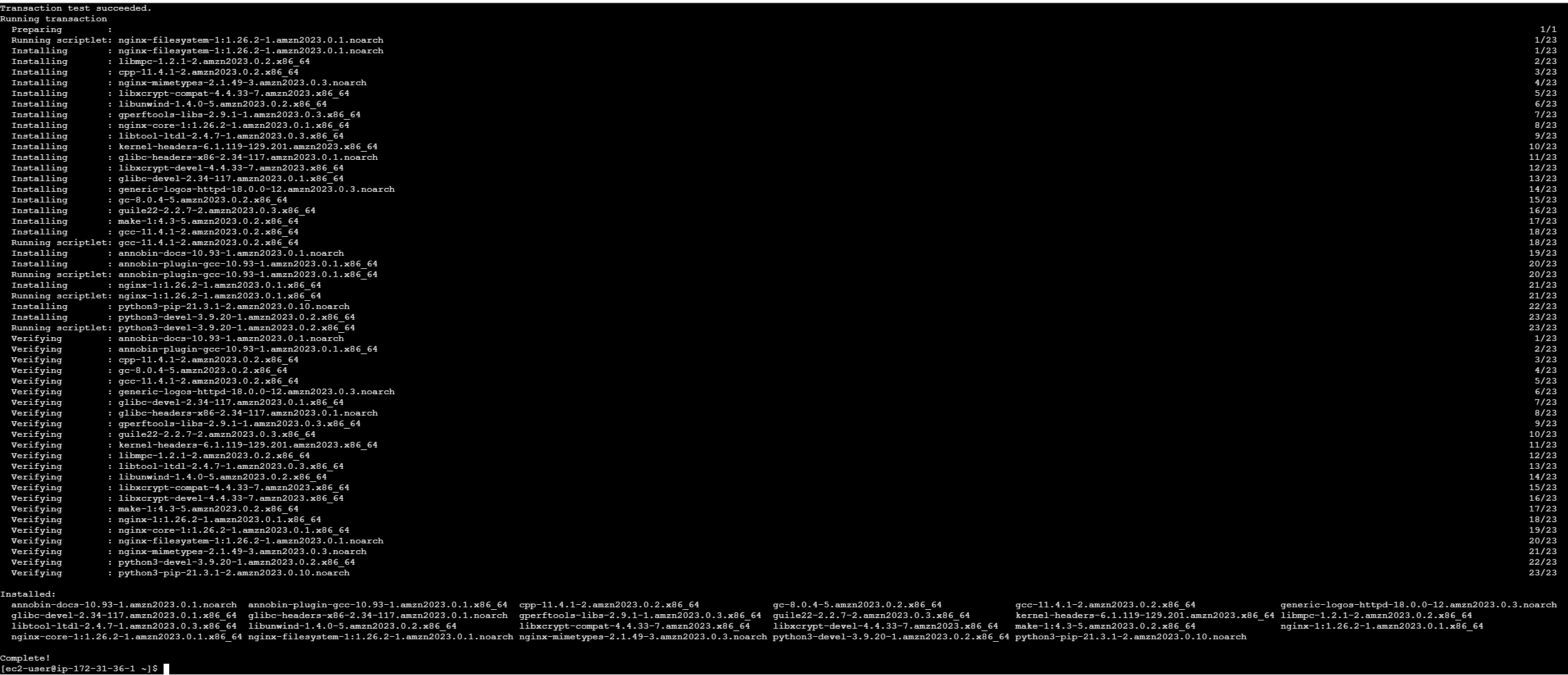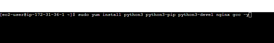 다음으로는 'sudo yum install python3 python3-pip python3-devel nginx gcc -y' 명령어를 통해 파이썬과 개발 도구를 설치해줍니다.