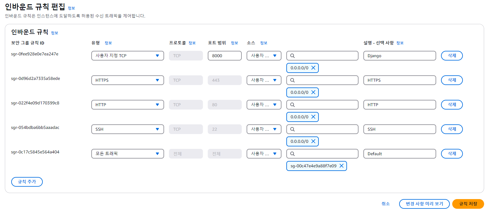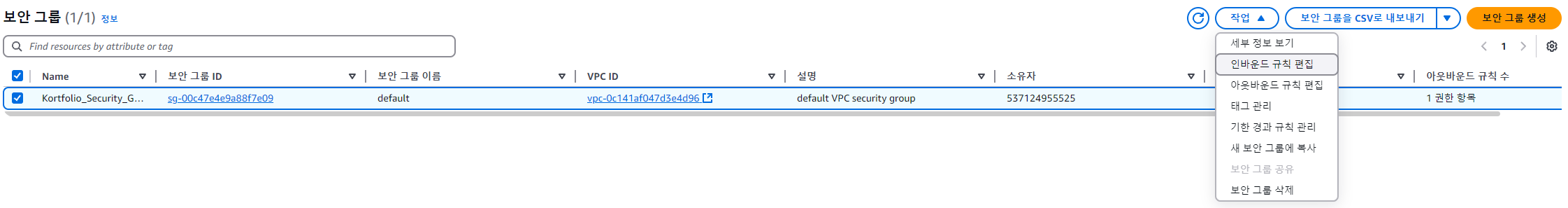 다음으로는 메뉴에서 '보안 그룹'으로 이동한 다음에, 인바운드 규칙 편집을 해줍니다.
