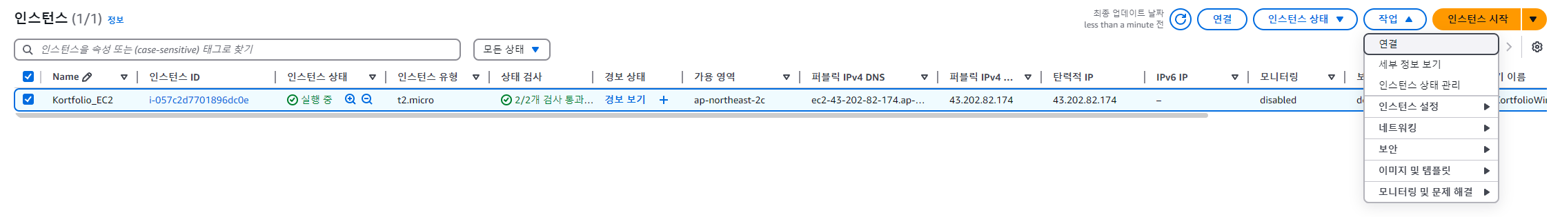 이제 인스턴스 메뉴로 돌아와서 '연결'을 해서 잘 동작하는지 확인해봅니다.