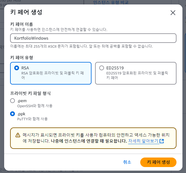 키 페어는 Windows에서 접근할 생각이라면 ppk로 리눅스로 접근하실거면 pem으로 설정하시면 됩니다.