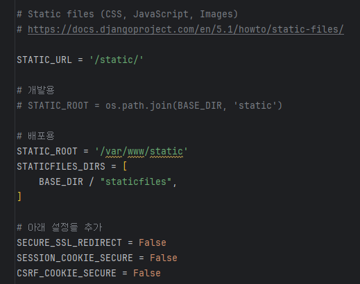 그 전에, settings.py에서 static 관련된 설정과 보안 옵션을 설정해줍시다.