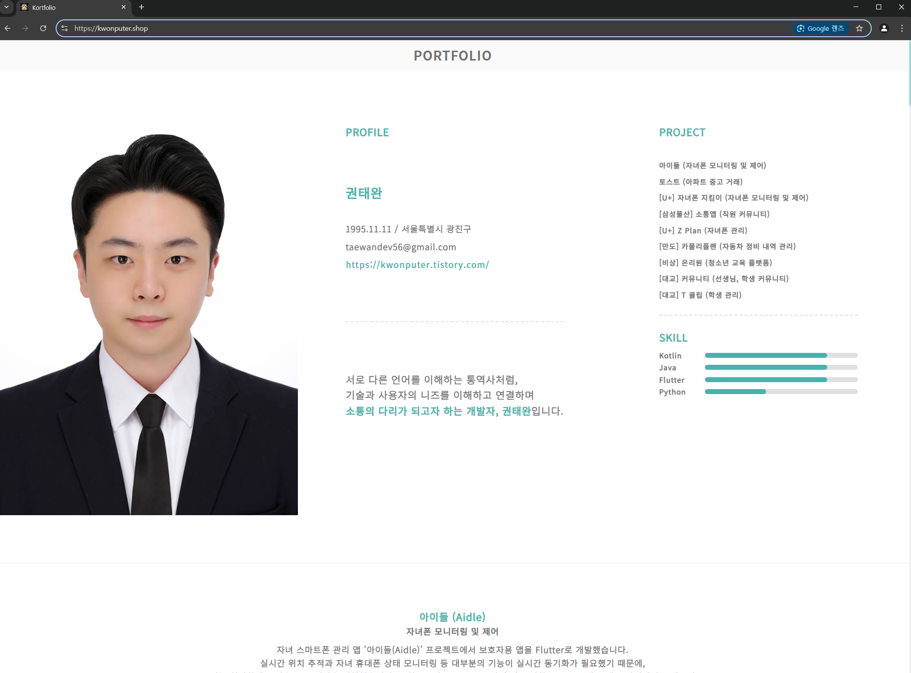 PROFILE 권태완 1995.11.11 / 서울특별시 광진구 taewandev56@gmail.com https://kwonputer.tistory.com/ 서로 다른 언어를 이해하는 통역사처럼, 기술과 사용자의 니즈를 이해하고 연결하며 소통의 다리가 되고자 하