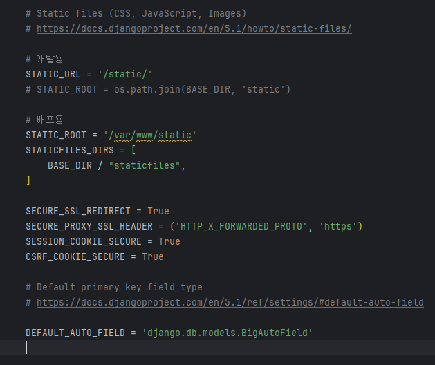 Django로 넘어오셔서, settings.py에 아래와 같이 코드를 추가해줍니다.