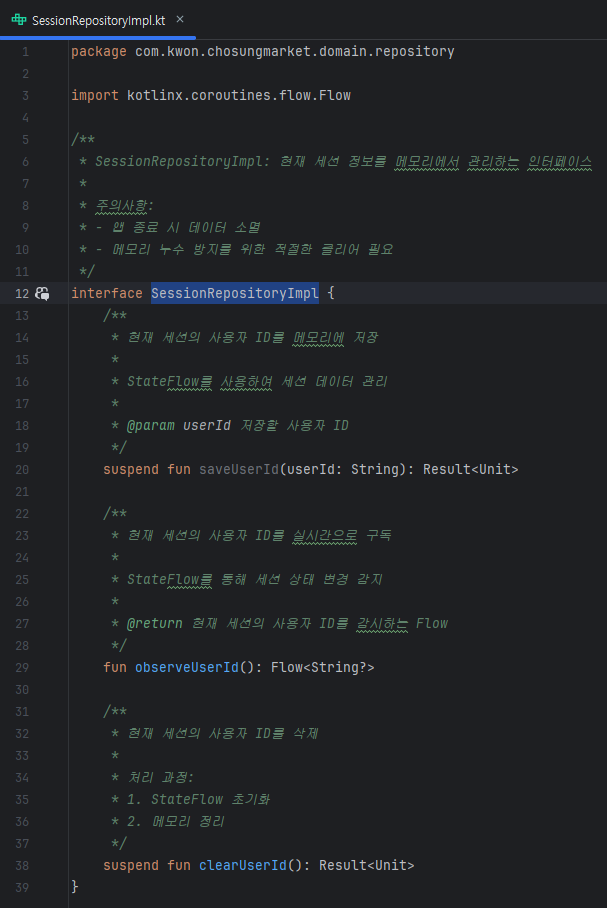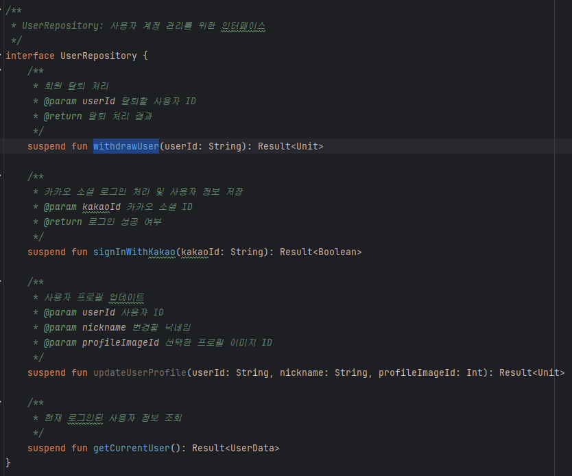다음은 위에 적은 내용을 바탕으로 kotlin으로 인터페이스를 만들어 보겠습니다. ㅎㅎ 제가 오랜만에 kotlin으로 개발하는거라 코드는 차후에 변경될 수 있다는 점 말씀드립니다~ (그래도 큰 틀은 그대로 유지입니다.)
