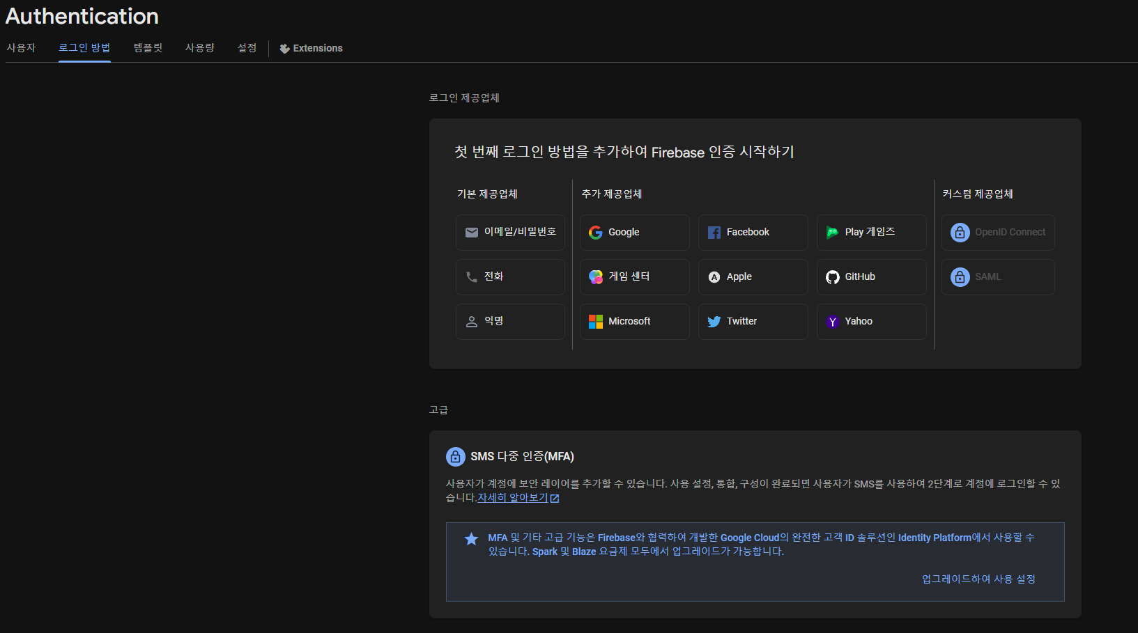 아니..! 이럴수가.. kakao를 로그인 방법으로 등록하려면 프로젝트를 업그레이드해야하네요?