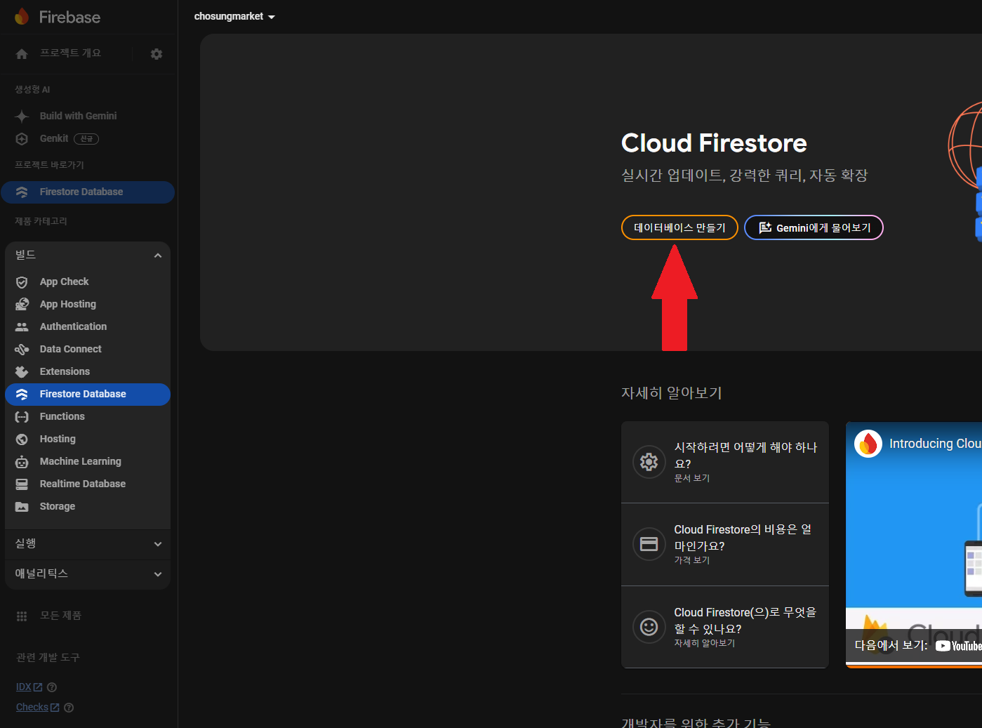 이번엔 콘솔로 이동하셔서, Firestore Database로 이동해줍니다!