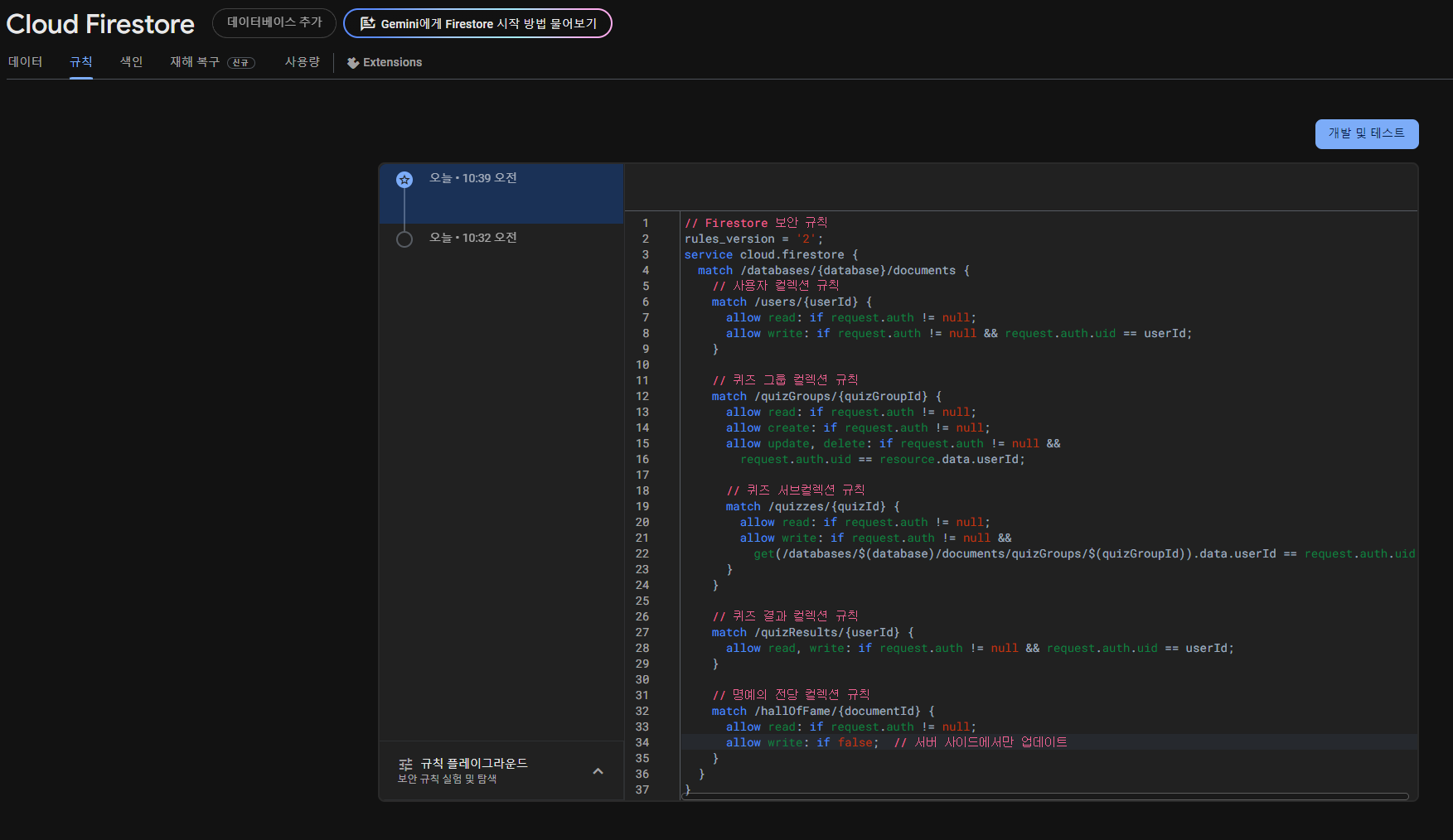 먼저 보안 규칙부터 작성해봅시다. 이 부분은 건너 뛰셔도 됩니다. 권한을 설정해주는 건데, 저도 하다가 불편해지면 빼버릴 생각이라서요~
