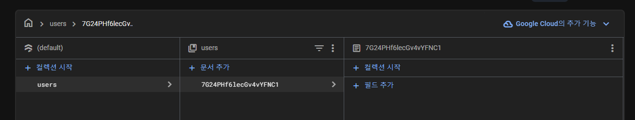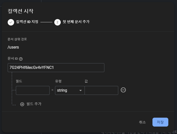 다음으로, 데이터로 넘어오셔서 컬렉션 시작을 통해 컬렉션을 만들어줍시다. 참고로 '첫 번째 문서 추가'는 안하셔도 됩니다. 클라이언트에서 데이터를 주입하면 알아서 생성되기 때문입니다~