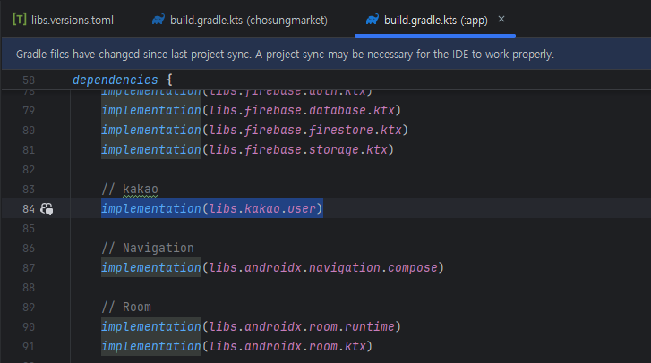먼저 libs.versions.toml와 gradle에 kakao sdk를 추가시켜줍시다!