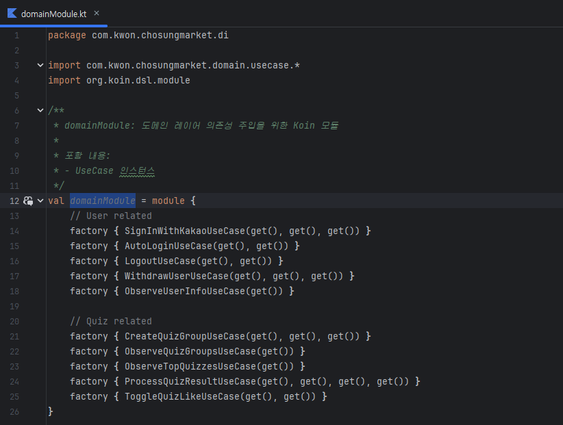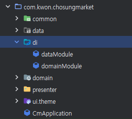 그런 다음에, dataModule은 data 레이어를 엮어주고, domainModule은 domain 레이어를 엮어주면 되겠습니다~!