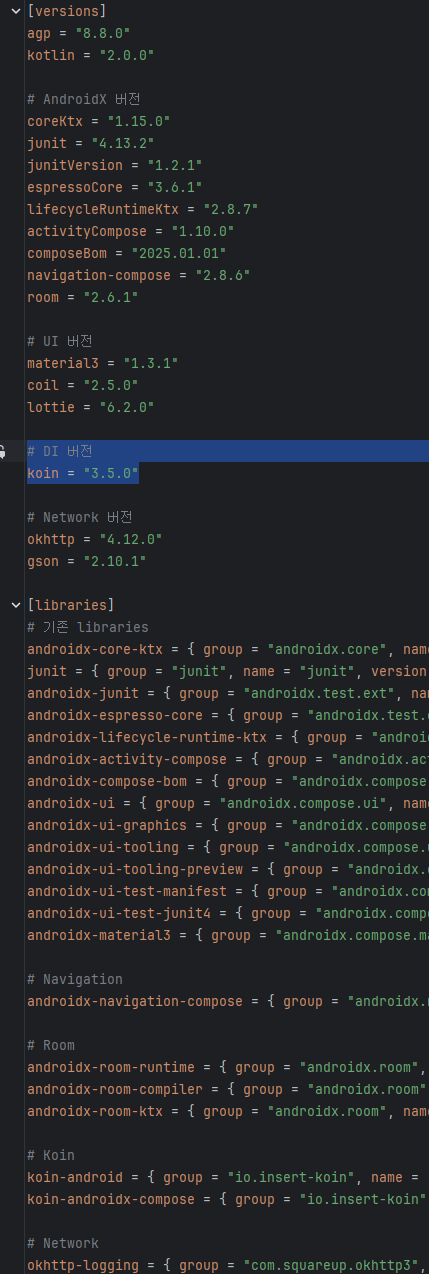 그 다음에, libs.versions.toml에 버전을 명시해줍시다! 저는 가장 최신 버전을 사용해보겠습니다~