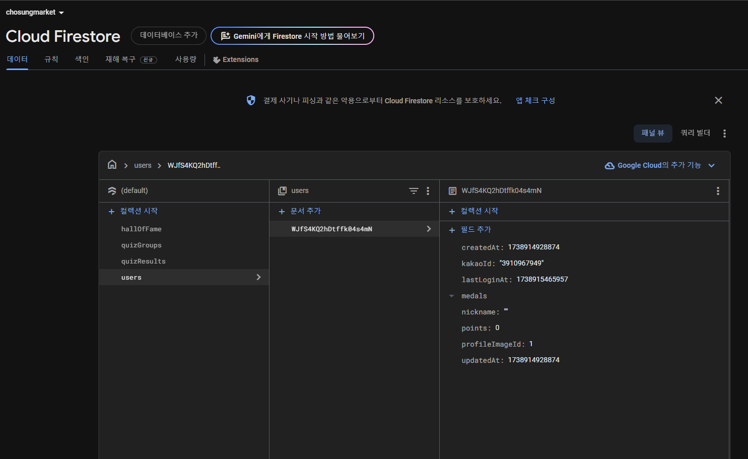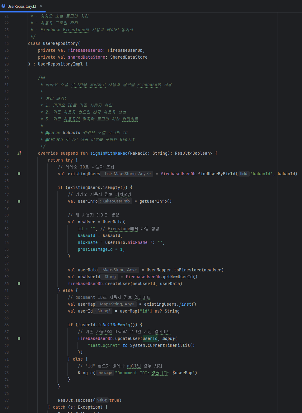 마지막으로 UserRepository의 signInWithKakao 함수에서 id를 찾는 부분이 있는데, 이 부분은 firestore의 문서 ID를 활용할 생각입니다.
