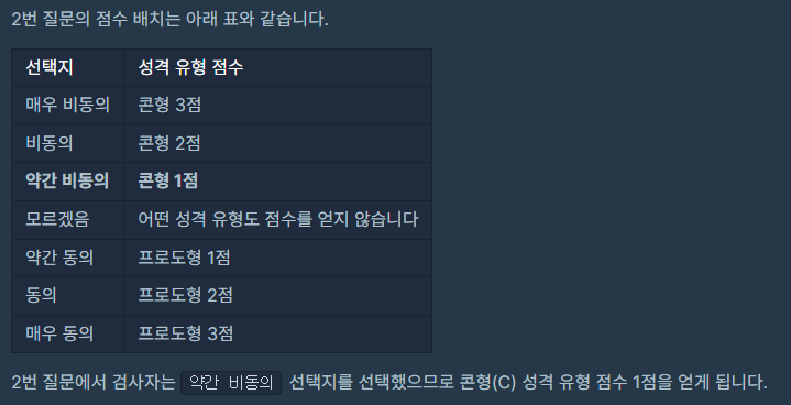 이제 좀 와닿네요. MBTI 검사랑 유사하네요. 약관 동의는 +1점, 매우 비동의는 -3점이라는 뜻이네요.