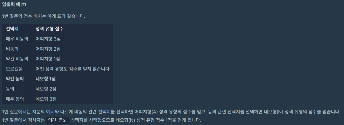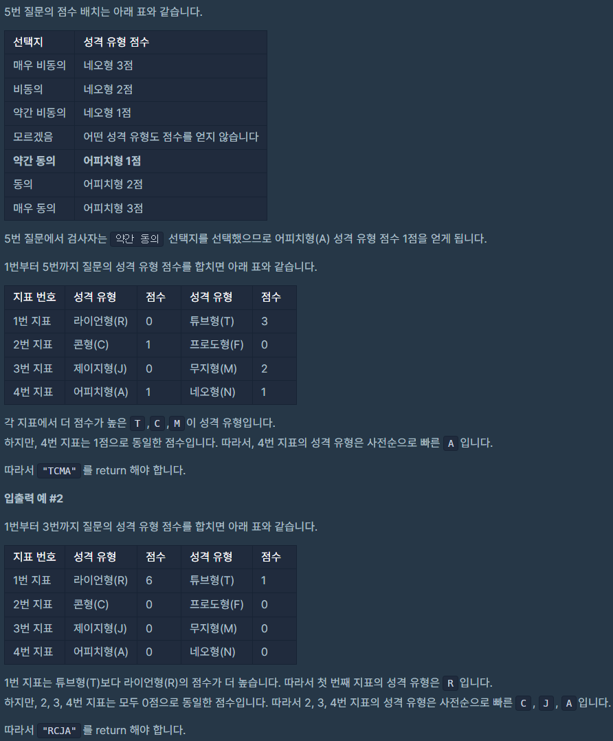 - survey[i]의 첫 번째 캐릭터는 i+1번 질문의 비동의 관련 선택지를 선택하면 받는 성격 유형을 의미합니다.