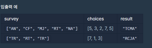 - survey[i]의 두 번째 캐릭터는 i+1번 질문의 동의 관련 선택지를 선택하면 받는 성격 유형을 의미합니다.