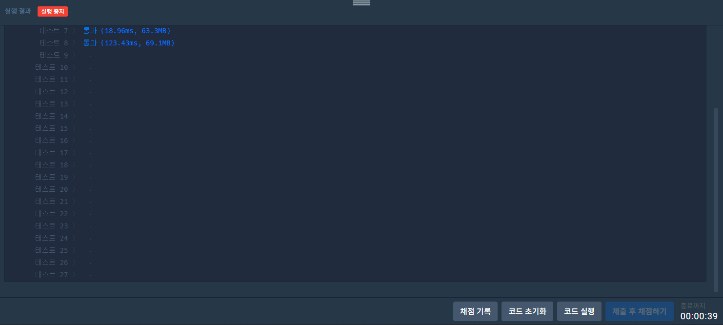 제 심정이 느껴지시나요..? 정말 촉박했습니다. 아니 갑자기 왜 이번 체점은 테스트가 27번까지 있는건지.. 진짜 조마조마했어요.
