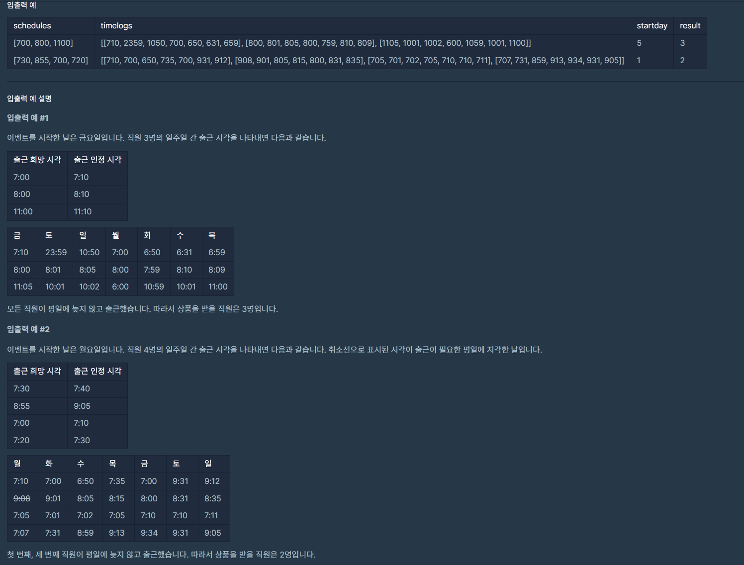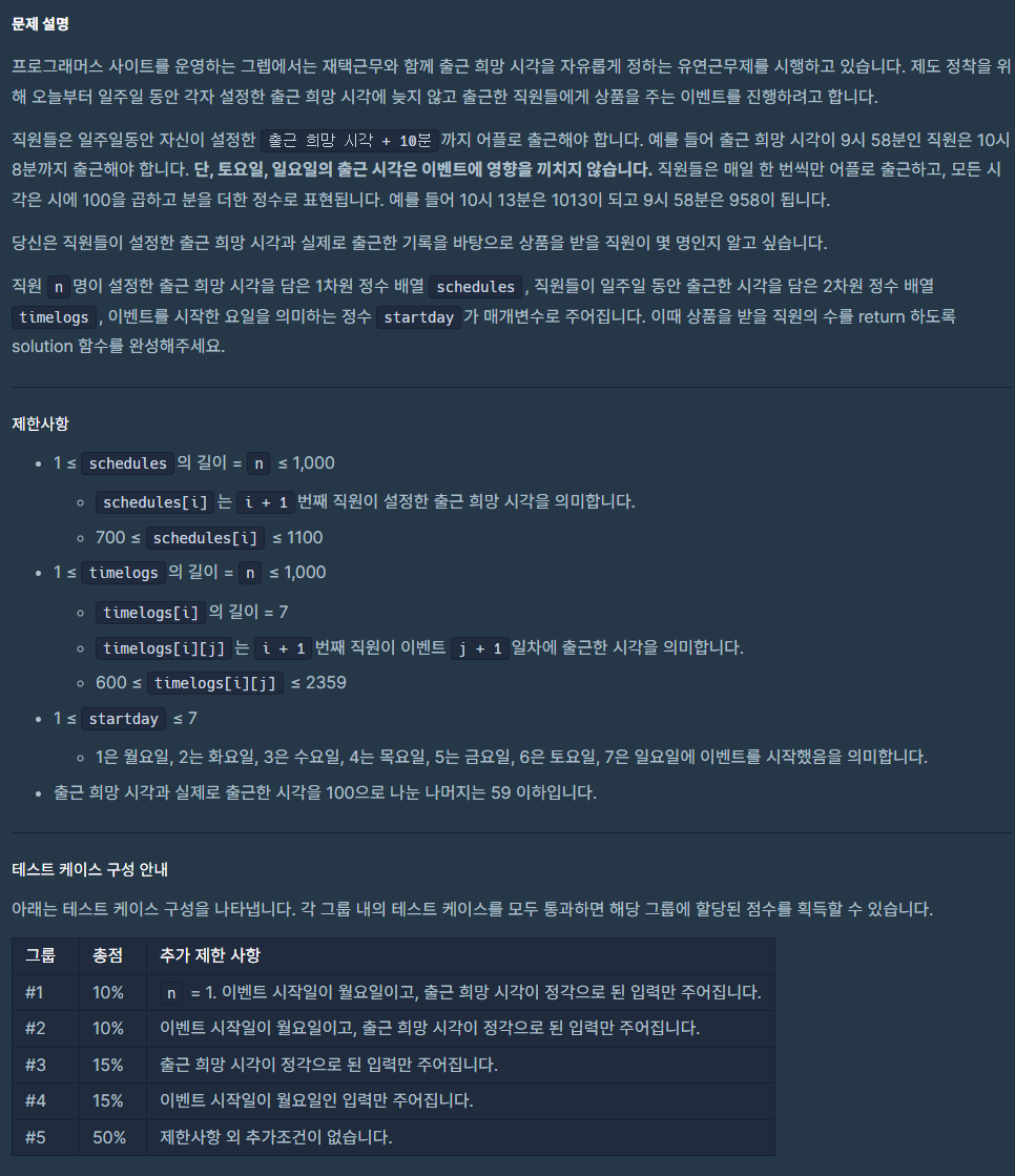 * 직원 n명이 설정한 출근 희망 시각을 담은 1차원 정수 배열 schedules, 직원들이 일주일 동안 출근한 시각을 담은 2차원 정수 배열 timelogs,