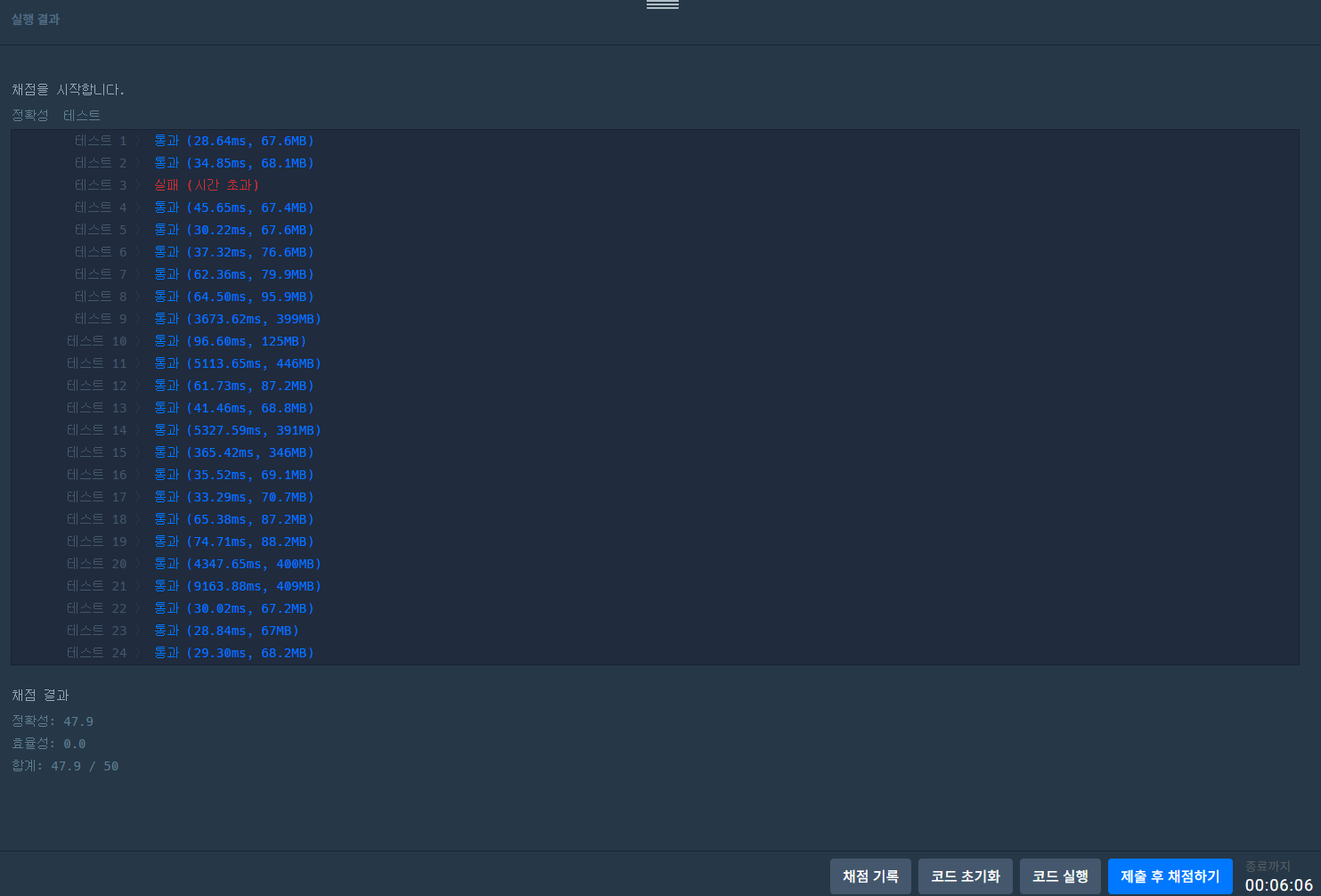 - 예전에 풀었던 문제가 나와서 여유를 가지고 다른 방법으로 풀어봤는데, '시간 초과'가 뜨더라구요.. 그래서 부랴부랴 코드를 수정하느라 이번에도 아슬아슬하게 풀었네요ㅠ