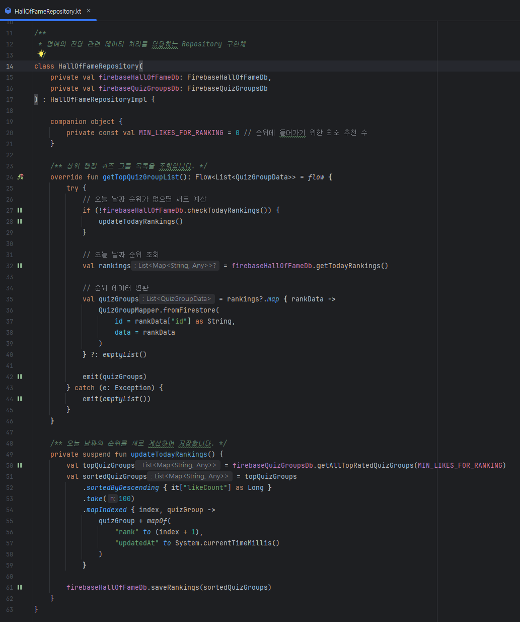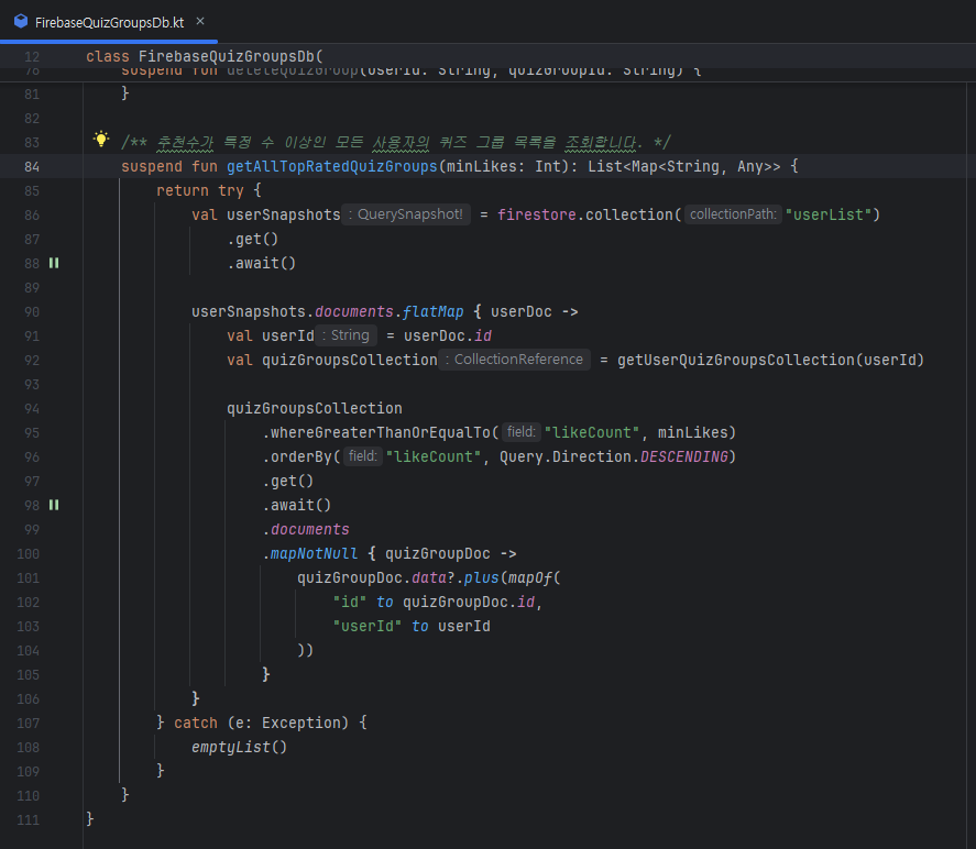 먼저, Firestore에서 추천수가 n개 이상인 quizGroupList를 가져오는 함수를 만들어줍니다.