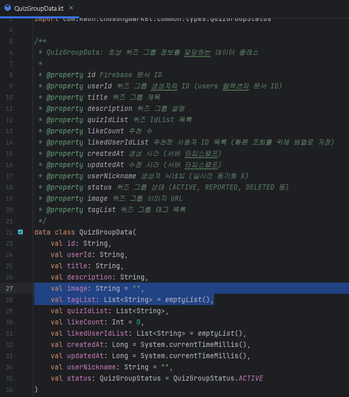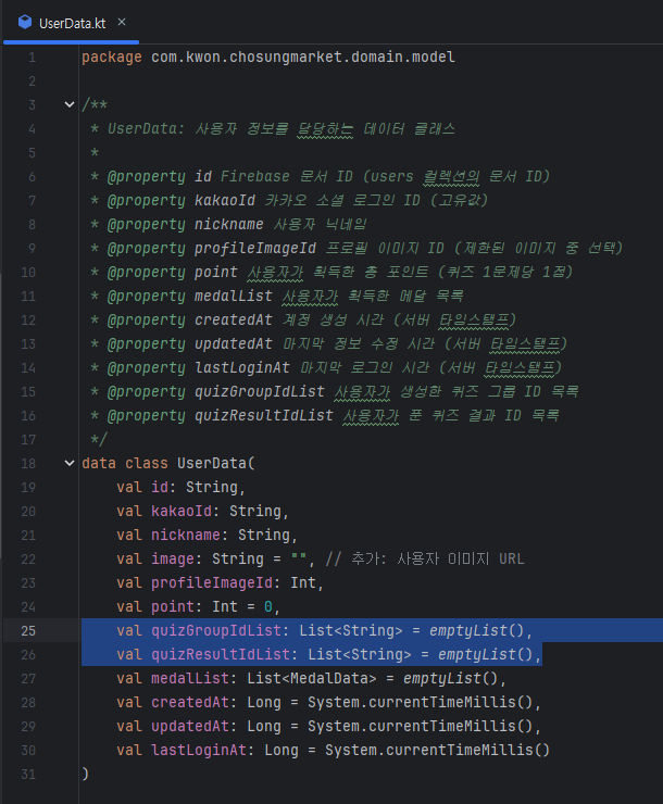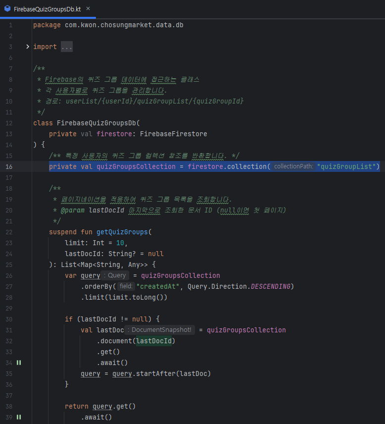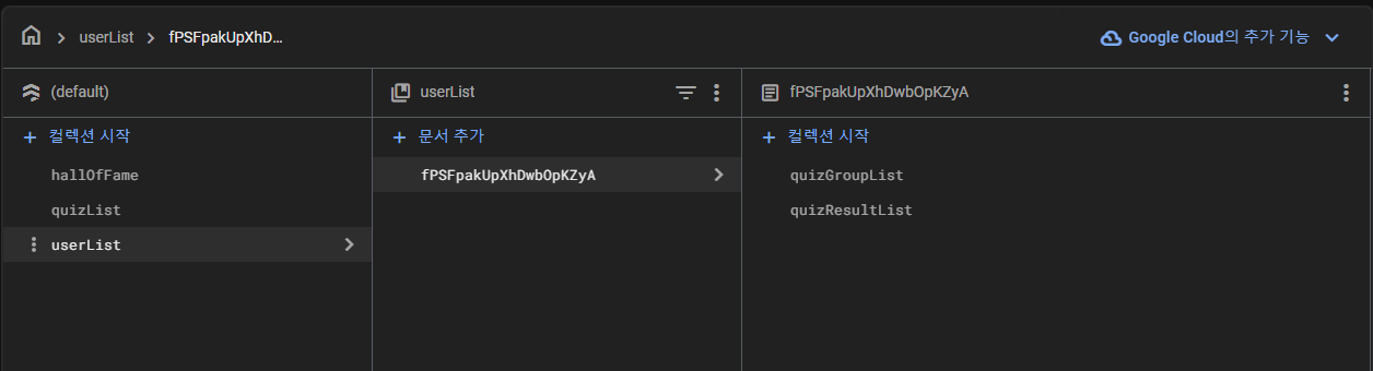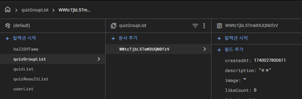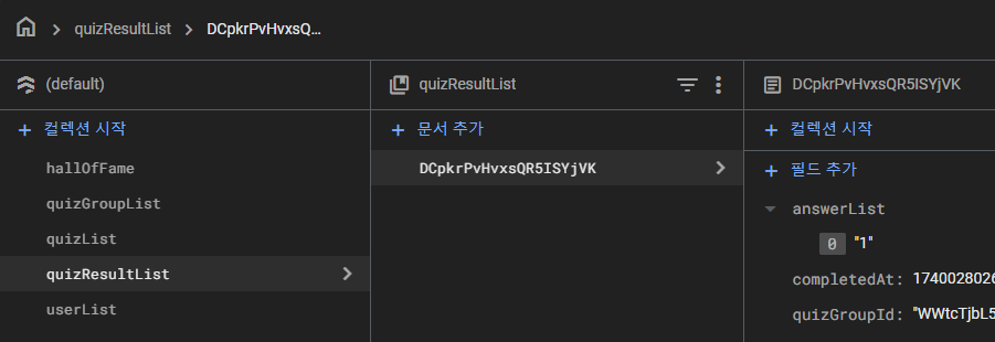 quizGroupList와 quizResultList를 메인 컬렉션으로 빼고, 유저가 가지고 있는건 ids로 설정하겠습니다.