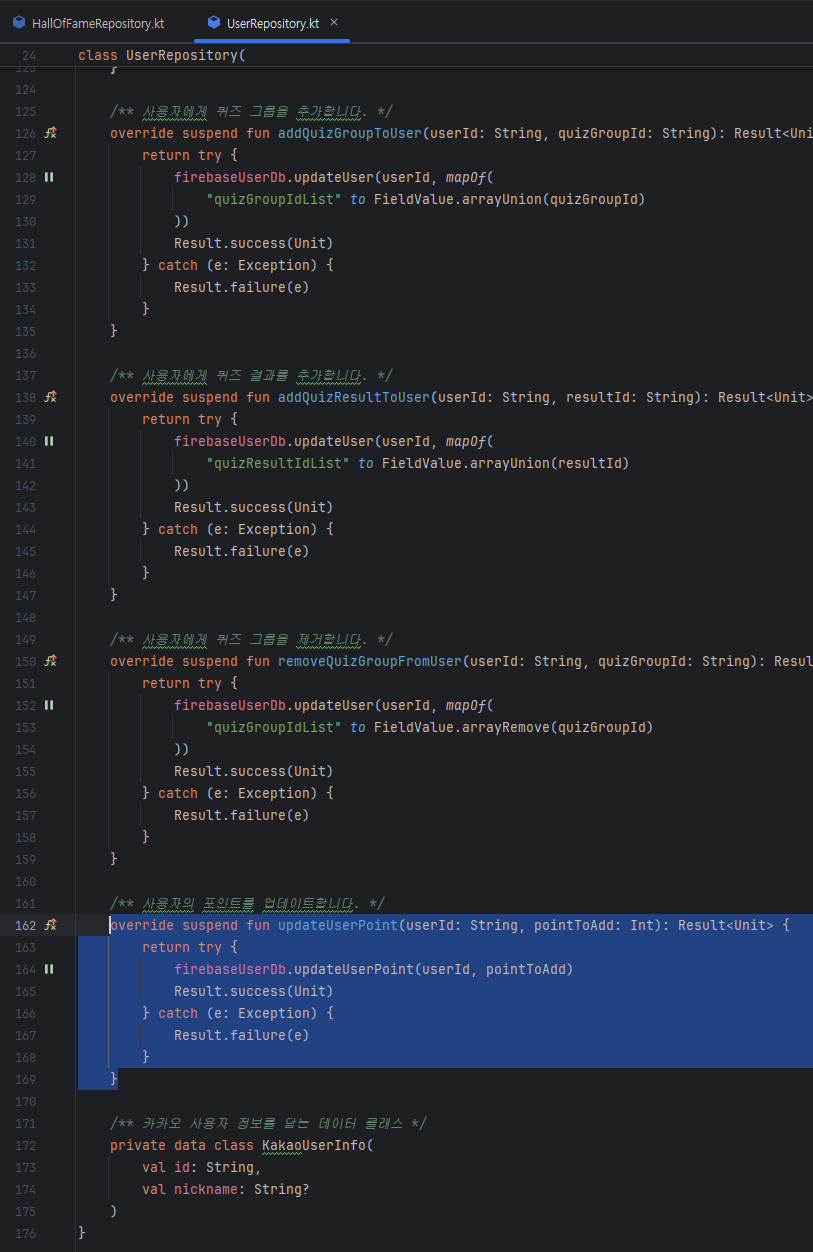 먼저, 'FirebaseUserDb'에 'point'필드를 정렬해서, 상위 n개만 가져오는 함수와 유저의 point 필드를 업데이트해주는 함수를 만들겠습니다.