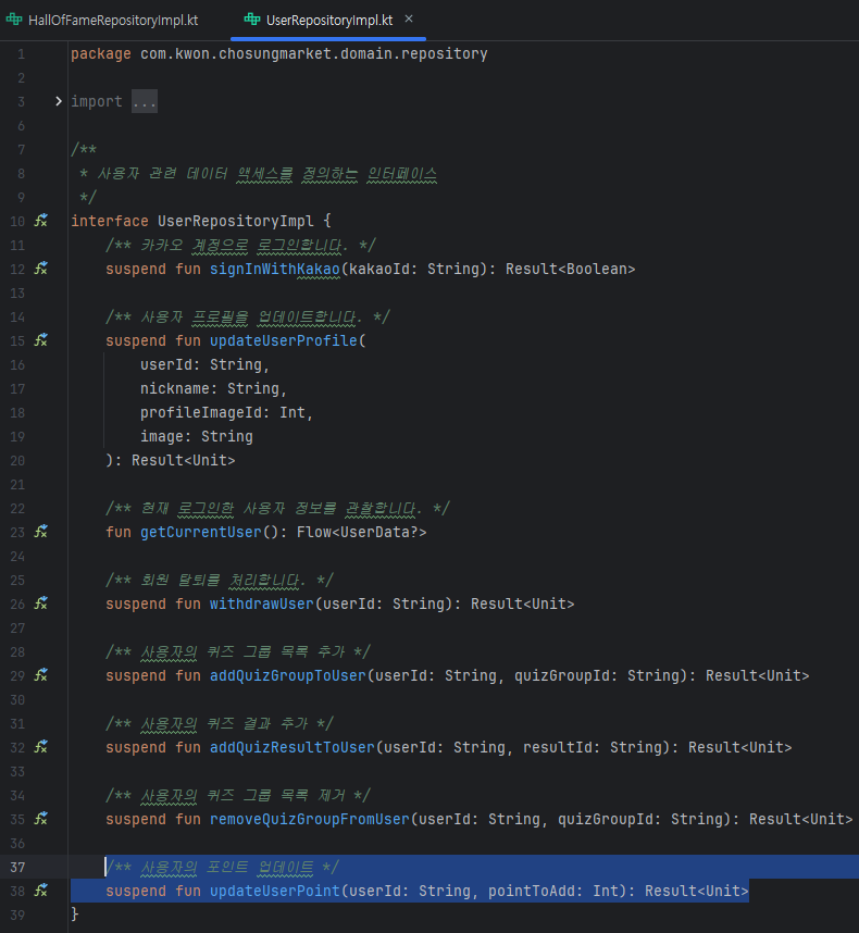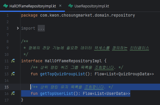 다음으로 domain 레이어의 'HallOfFameRepositoryImpl'와 'UserRepositoryImpl'에 상위 유저 목록 조회와 유저 포인트 업데이트 함수를 정의하겠습니다.