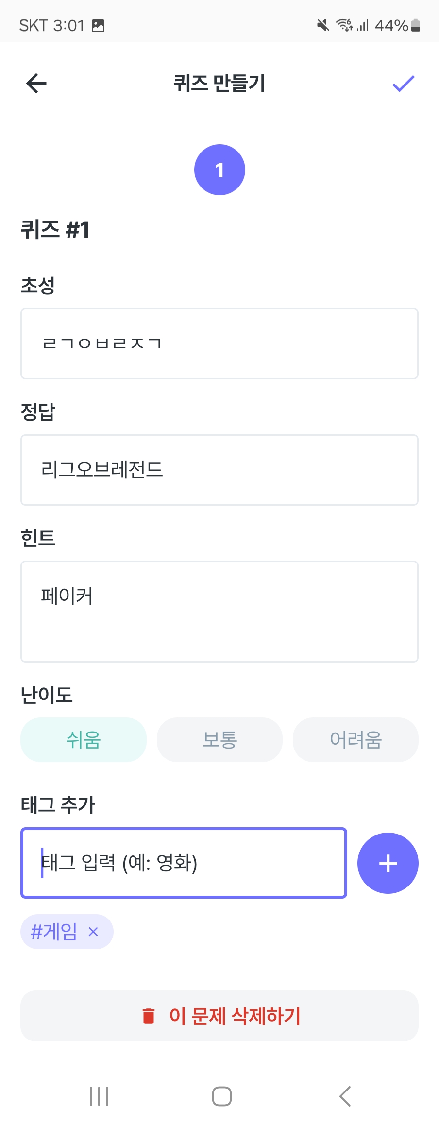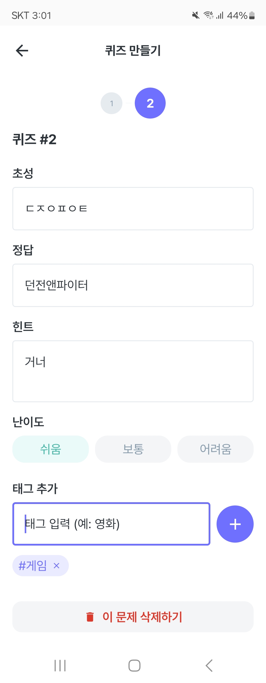그리고 난이도의 경우에도 퀴즈 개별마다 선택할 수 있도록 수정하고, 태그 기능도 추가해보겠습니다.