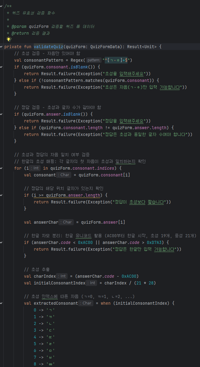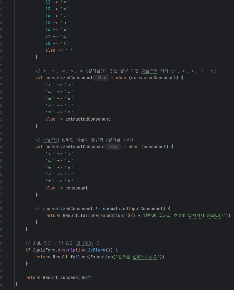 - 2차 검증: 초성이 자음만 존재하고, 초성과 정답의 글자 수가 같다면, 각 글자의 첫 자음이 초성과 일치하는지 확인.